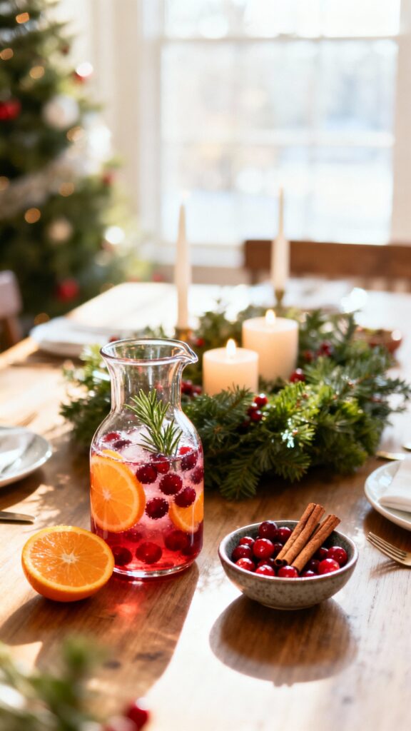 - Pitcher or Carafe: One signature drink—cranberry-rosemary spritz, spiced pear punch, or mulled wine.