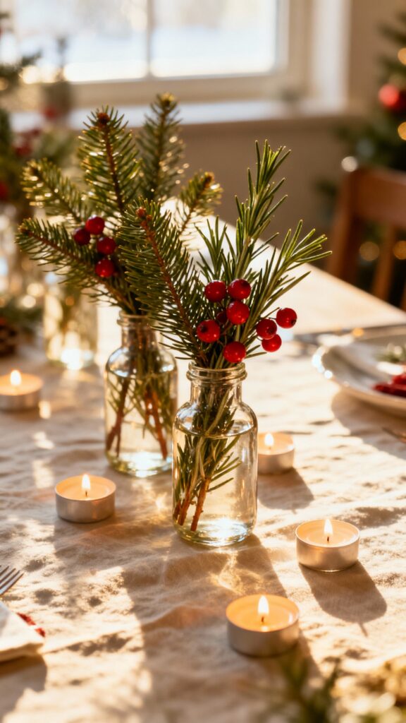 Skip the summery look and bring in a cozy Christmas touch. Fill small glass bottles with a mix of pine or cedar sprigs, rosemary, and a few red berries like rosehip or viburnum. Line them down the center of your table and add a few tiny tealights or gold-speckled candles between them.