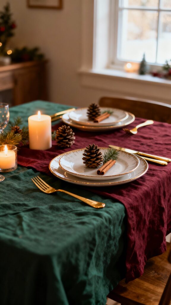 Layer forest-green or deep-red linen runners over neutral tablecloths. Add twine-tied napkins with a pinecone or a small cedar sprig for festive detail.