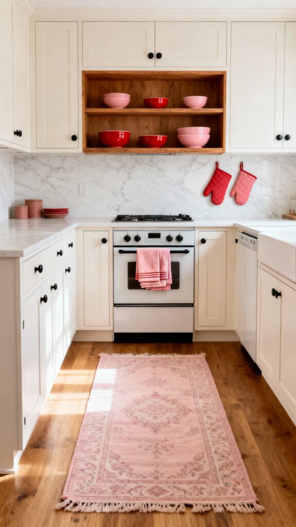- Swap textiles: dish towels, oven mitts, and a runner rug in a muted red or blush.