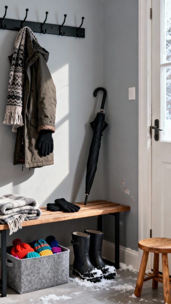 Winter chaos starts at the door. Set up a basket-based command center so wet gloves don’t migrate to your sofa like they pay rent.