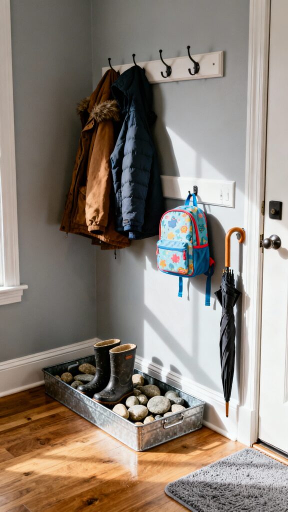 - Hooks at different heights: Tall coats up high, kids’ bags lower. Everyone gets their spot.