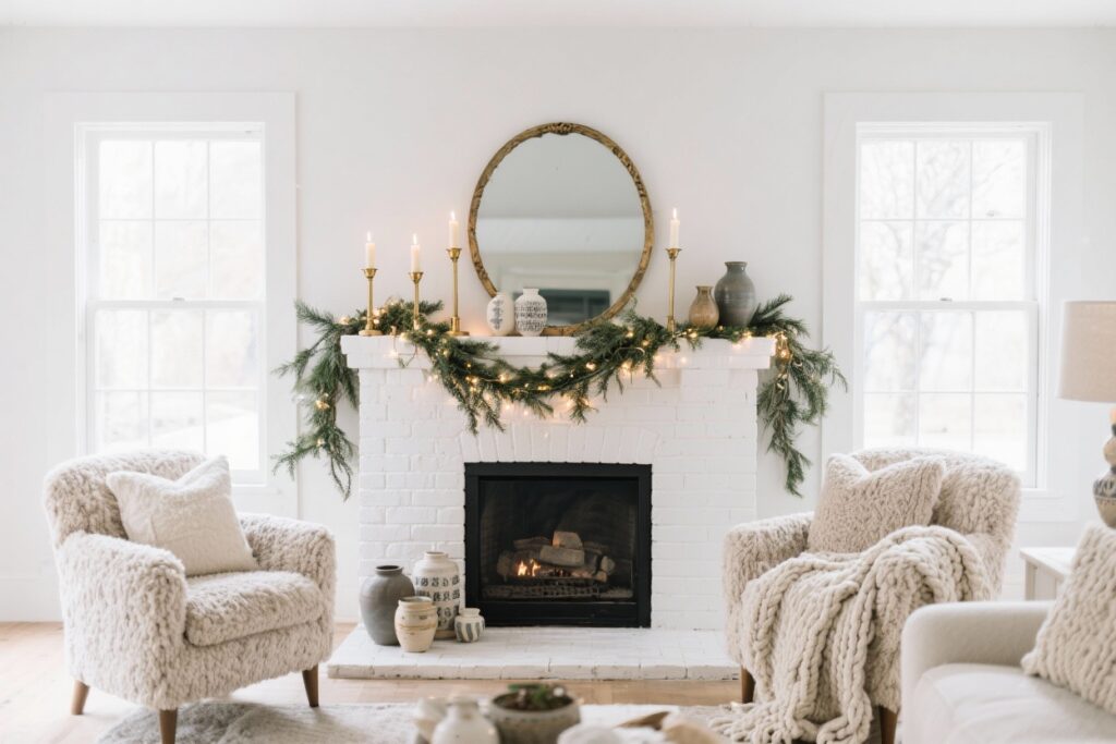 - Texture game: Add chunky knit stockings, linen garlands, and a wool runner on the mantel itself.
