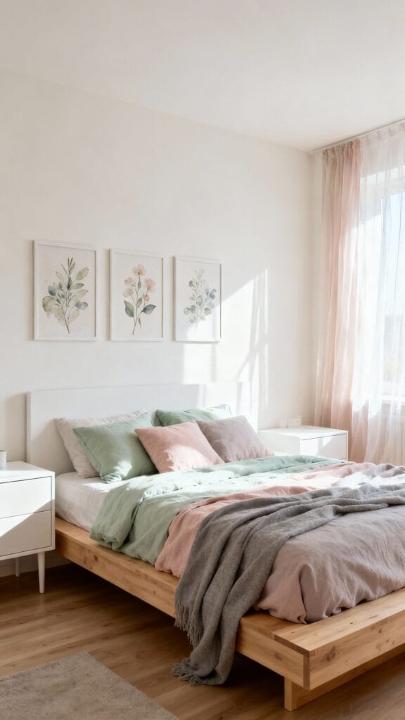 Keep furniture sleek with a light oak platform bed and white nightstands. Layer pale sage, blush, and dove gray textiles with gauzy curtains that float.