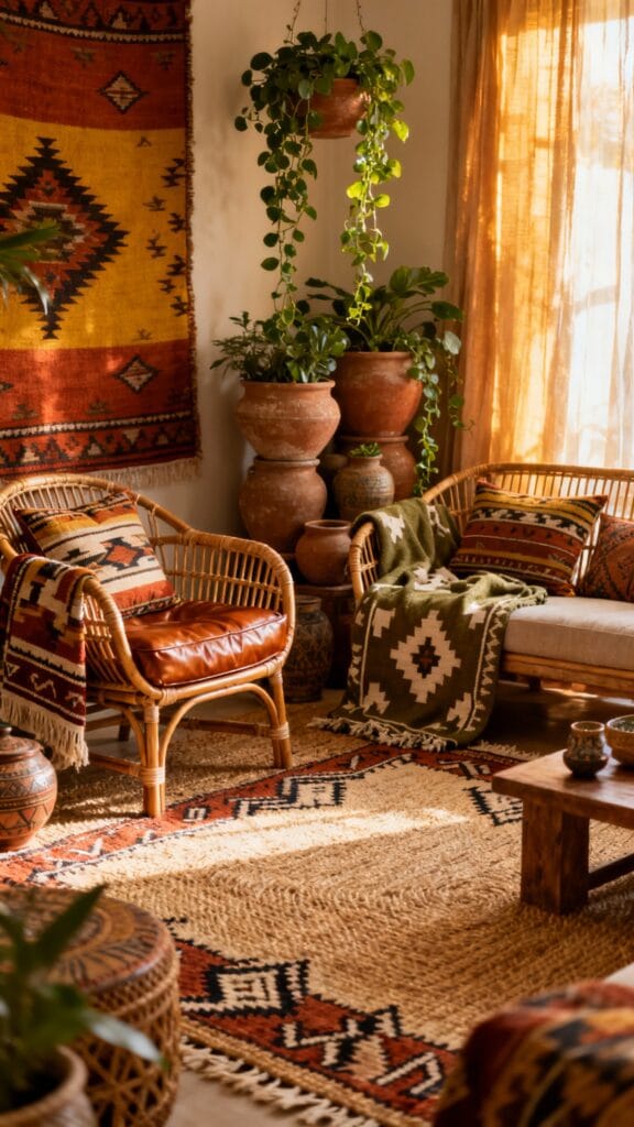 Earthy decor focuses on natural materials, warm neutral color palettes, and layered textures that create a grounded, cozy feel. Think wood, stone, clay, linen, and wool paired with tones like terracotta, sand, cream, and sage.