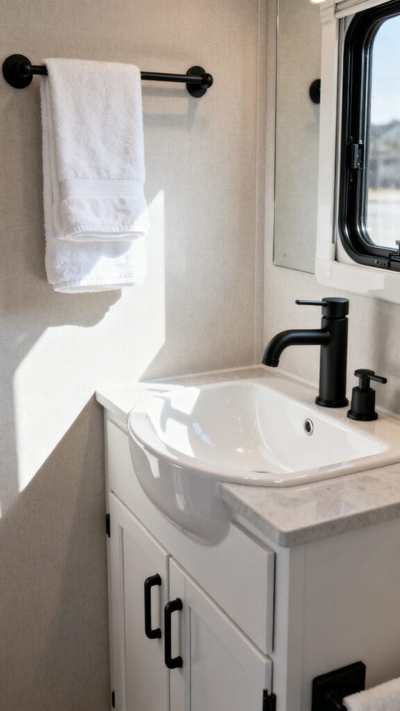 This design works wonders for smaller camper bathrooms where lighting might be limited, helping everything feel more spacious and calm.
