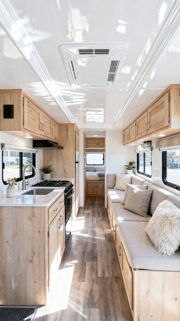 Flooring can make or break a camper interior. Light-colored vinyl plank or laminate flooring in white oak or ivory tones enhances brightness and continuity. It’s also easy to clean and adds a touch of homey warmth to a compact space.
