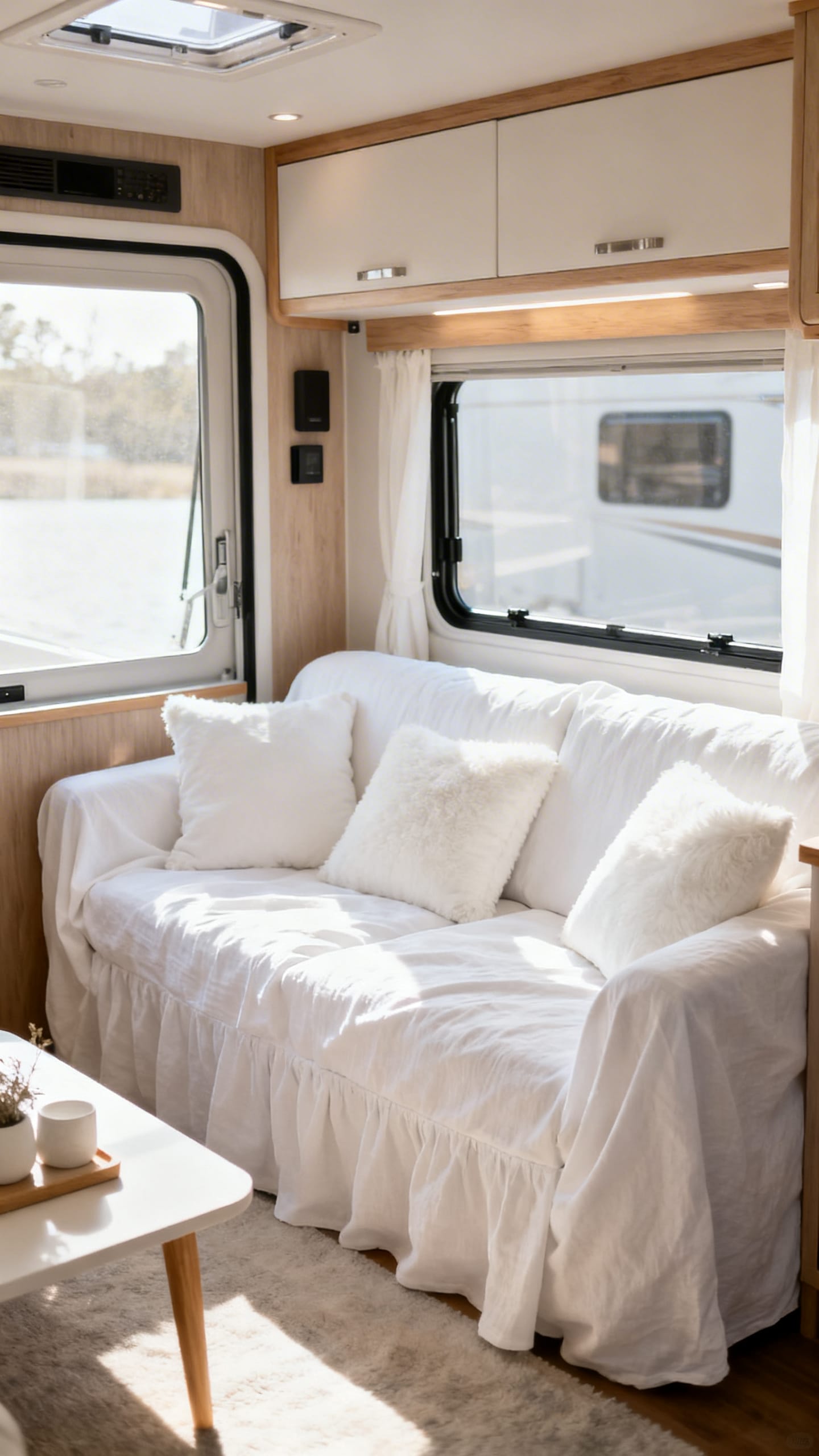 Soft furnishings are your secret weapon for transforming your camper into a retreat. Crisp white bedding, throws, and cushions create that boutique-hotel feel. Layering textures prevents the monochrome scheme from feeling cold or sterile.