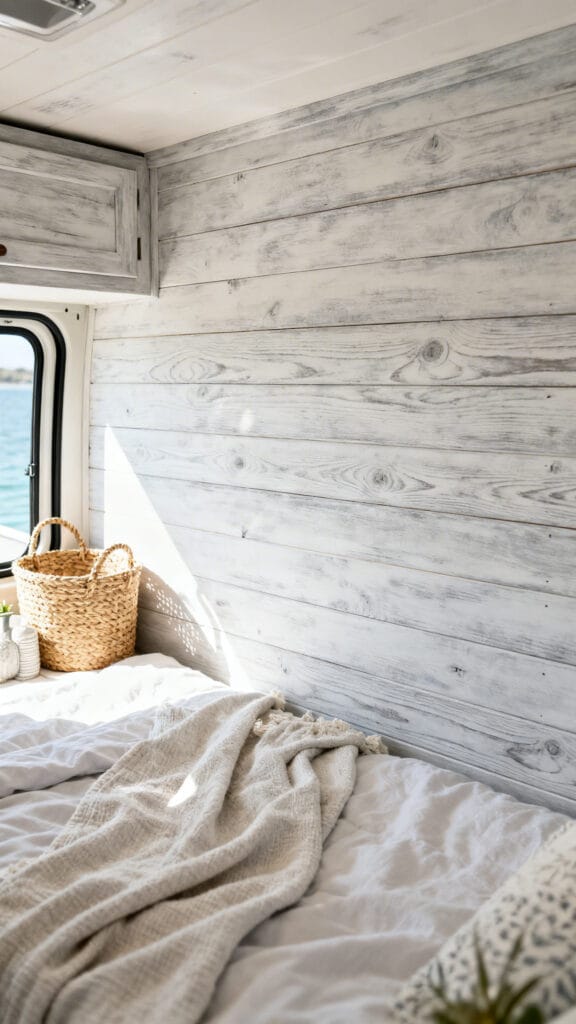 Want a coastal-cottage vibe? Whitewashed wood paneling adds texture while keeping things light. It’s subtle enough not to shrink the room visually but adds tons of charm.