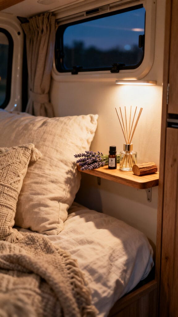 Scents dramatically influence mood, and in a camper, that’s even more noticeable. Subtle aromatherapy elements like reed diffusers or essential oil sprays can help you relax instantly after a long day of adventure.
