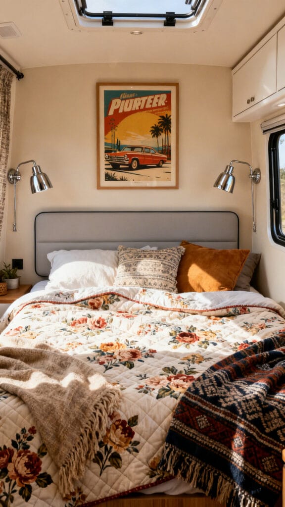 Mixing styles keeps your camper bedroom visually interesting and full of character instead of overly “matchy.”