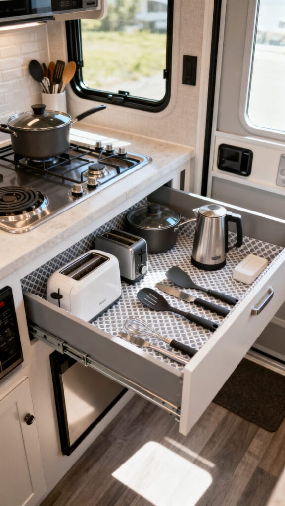 This setup not only saves space but also adds a stylish, professional-chef vibe to your RV kitchen.