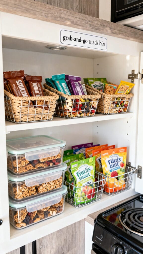 Dedicated snack bins prevent clutter and make packing for day trips easy. Store granola bars, trail mix, or fruit packs so everyone can grab a quick bite. Great for families and quick stops.