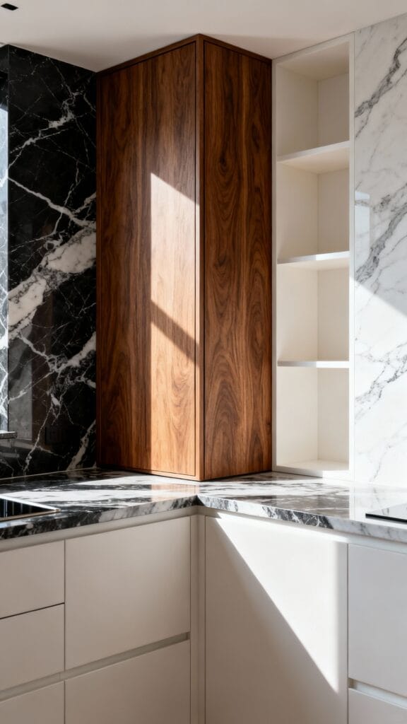 Go graphic and glam. A dark pantry cabinet anchors the corner while bright counters and veined stone keep it luxe.