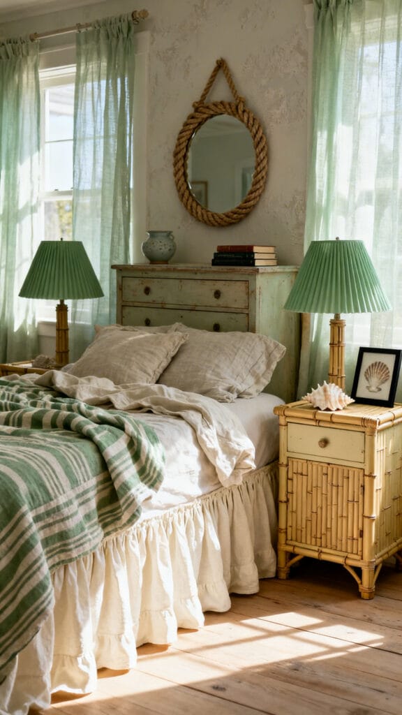 Light, airy, and beach-adjacent without starfish overload. Use cream walls, sage shiplap headboard, and sandy wood tones.