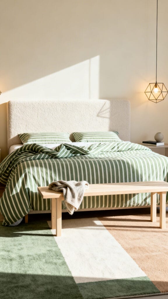 Clean, bold, and playful. Use a cream base with sage striped bedding and a color-blocked rug.
