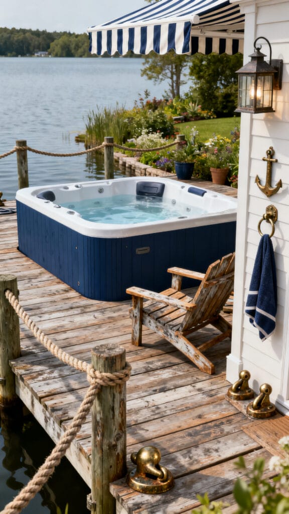 Bring marina vibes inland with rope railings, weathered planks, and a navy-and-brass detail set. Mount boat cleats as towel hooks—cute and practical.