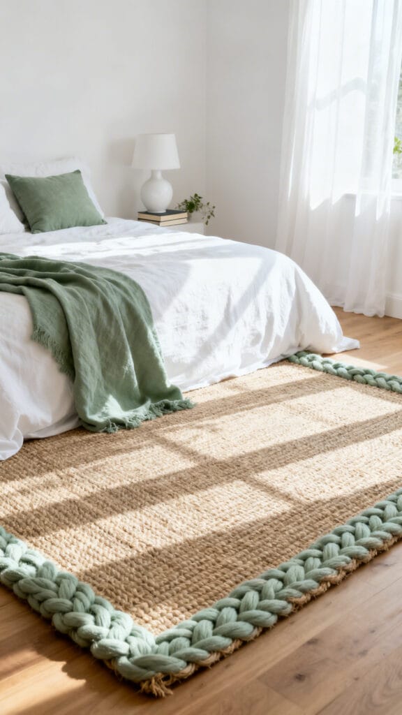 A jute or sisal rug grounds the space and adds organic texture. A sage border brings the palette down to the floor.