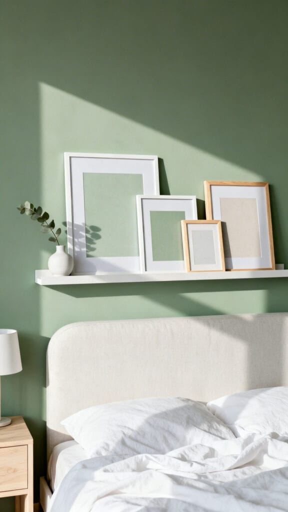 Picture ledges let you rotate art and decor without new holes. Mix white frames, natural wood, and sage accents for a layered look.