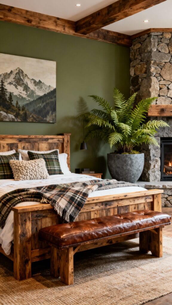 An emerald velvet headboard or bench, walnut nightstands, and an oversized fern in a ceramic pot make a strong impact. Layer with textured throws, linen curtains, and brass lighting to complete the elevated, cocoon-like feel.