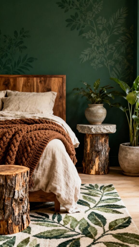 Bring the ground up—figuratively. Every surface feels tactile and earthy, grounded by deep botanical tones.