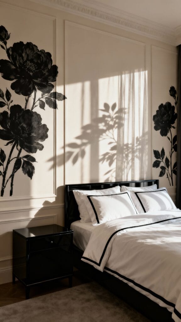This bedroom feels like a secret greenhouse at midnight—mysterious, lush, and a little wild. You’ll layer dramatic flora against deep, inky walls so the greenery practically glows.