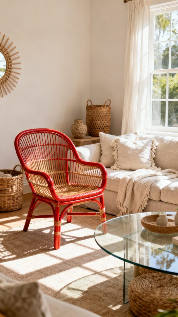 - Add one bold item — like a rattan chair — as an anchor.