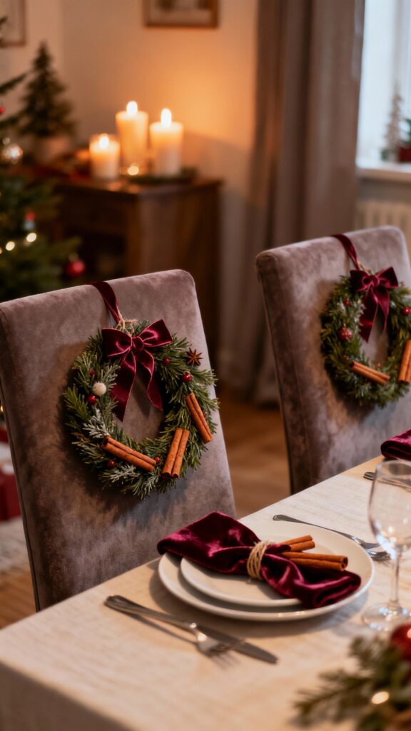 Textiles complete the look: a tartan throw draped over a chair, a velvet bow around cutlery, or bells tied onto greenery for a soft jingle. Keep it airy and balanced — too much décor can crowd the beauty of your setup.