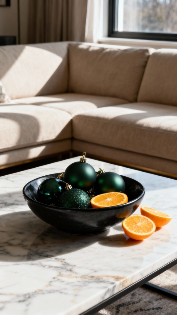- Botanical bowl: Mix cedar, pine, and magnolia leaves in a wide shallow bowl.
