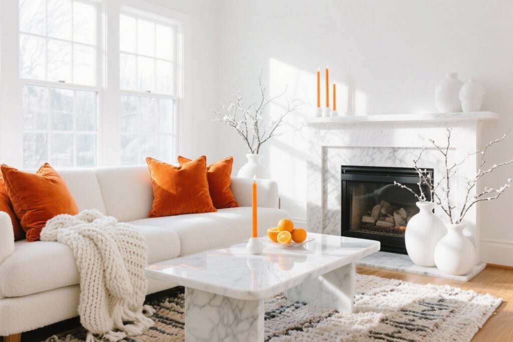 Wrap-Up: Orange and white in winter is the stylish friend who shows up in a cream sweater and killer boots—effortless, warm, and put together. Start small with candles and citrus, then build into textiles, art, and natural materials. You’ll get that cozy glow without the clutter—and you might even keep some of it up till spring. Go ahead, claim your chic winter vibe.