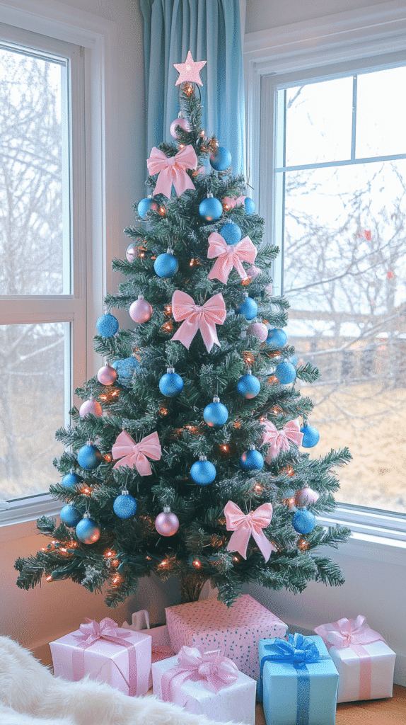 This color pairing works best in bright spaces with a lot of natural light. A stylist friend once showed me that you don’t need much blue at all. A few pale-blue glass ornaments or a soft ribbon is enough to balance the pink. One practical tip: pastel blue looks surprisingly good under warm lighting, and the pink helps keep the whole tree from feeling too icy.