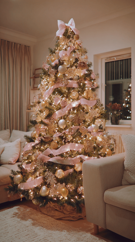 Pink and gold can be gorgeous, but only if the two colors aren’t fighting for attention. What worked for me was using gold for the main structure of the tree — ribbon, larger ornaments — and adding pink as an accent. If you’re using gold ribbon, pick a textured one instead of a perfectly smooth finish. It reflects light in a softer, more flattering way.