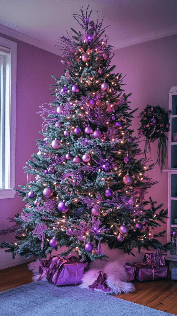 Pink and purple can go whimsical really fast, so the trick is to use deeper purple shades instead of bright violet. Colors like plum or eggplant make the tree look grown-up instead of cartoonish. One trick I loved: place purple lights inside the tree for subtle depth, and keep the outer layer lit with warm white or soft-pink LEDs. The layered lighting gives the tree a richer look.