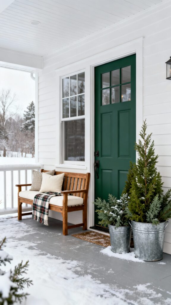 Stick to neutral greenery, natural textures, and soft lighting instead of red and gold accents. This keeps the porch stylish through January and February.